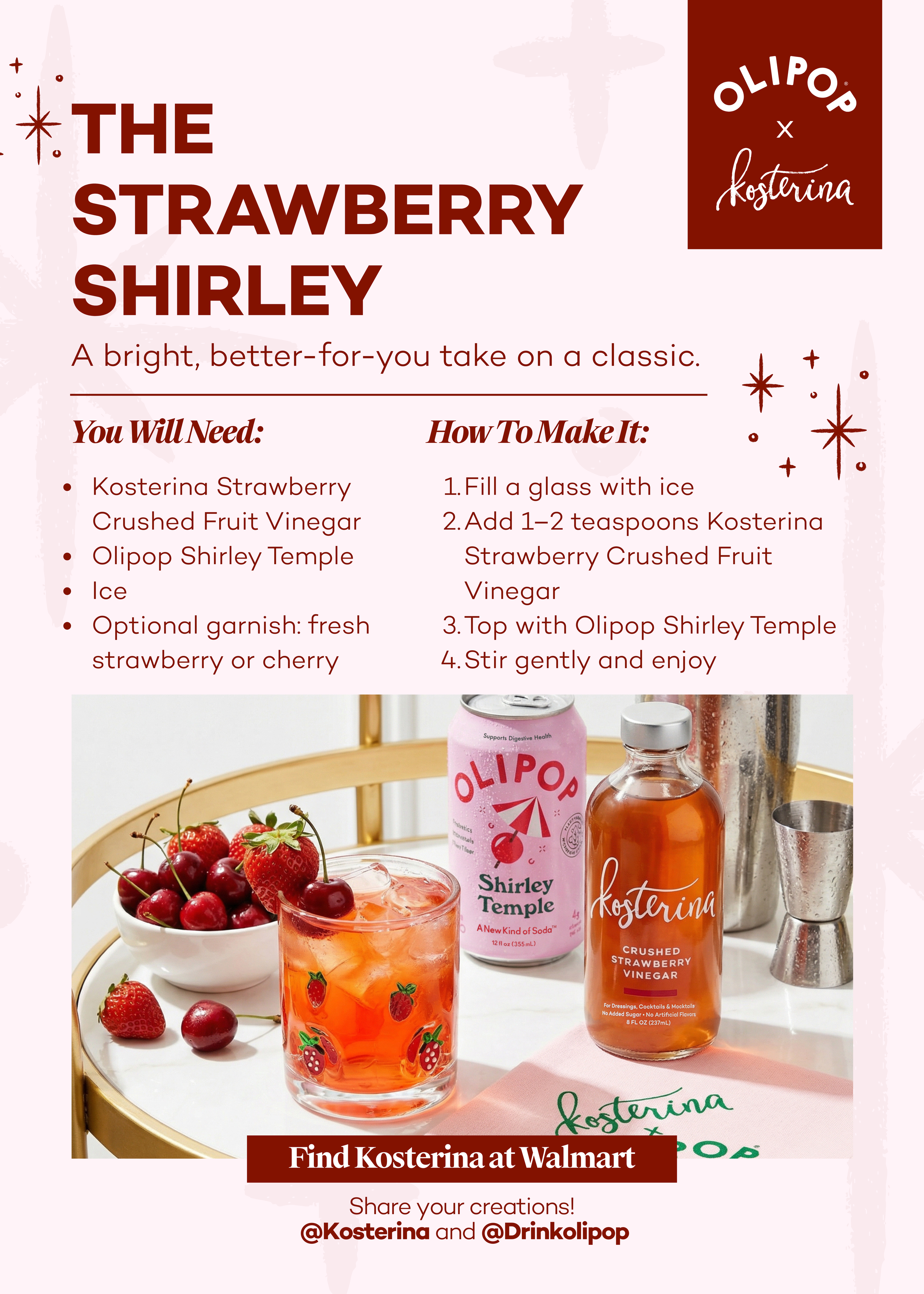 Outcome: The result was a visually compelling mailer insert for 100 influencers showcasing the new Olipop Shirley Temple Flavor alongside Kosterina’s Strawberry Crushed Fruit Vinegar that will be sold in Walmart. See below for some examples of what a few influencers posted to their social media when they received this package.